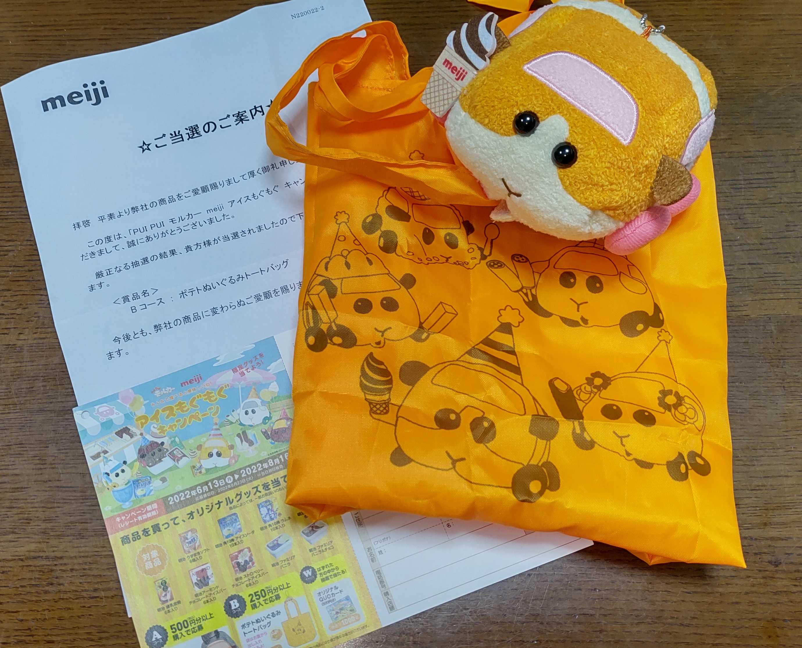 明治のうずまきソフト🍦や🍓ストロベリーチョコアイスバーを買ったレシートがあったのでWチャンス(1,000名)のクオカード狙いで応募したら…Bコース(500名)に当たりました😉@佐川急便🍀PUI PUI モルカー meiji アイスもぐもぐキャンペーン🎁ポテトぬいぐるみトートバッグ何のキャラ? モルカーズって書いてるわ。ぬいぐるみのお腹からトートバッグが出てきました😅エコバッグとして使わせていただきます😊💕ありがとうございます💕
