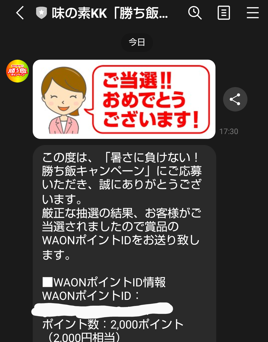 LINEに当選通知が届いてました😉🍀マックスバリュ西日本&味の素🎁WAON ポイント 2,000ポイントWAON ポイントのサイトに自分のWAONカード番号を登録して店頭のWAONステーションで受け取りです💰💕ありがとうございます💕