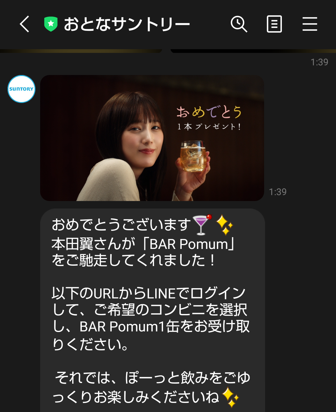 サントリーのLINEで当たりました🍸LINEの場合、当選後にコンビニ選択ローソンは終了 (人気あるのね…)セブンイレブンにしました😉16日にHPで知ってツイッターやLINEで応募あっけなくハズレ (最近結婚した芸人が出てきます)・当選数 47万人・9/27 23:59まで・コンビニ引き換え(セブンイレブン、ファミマ、ミニストップ、セイコーマート)