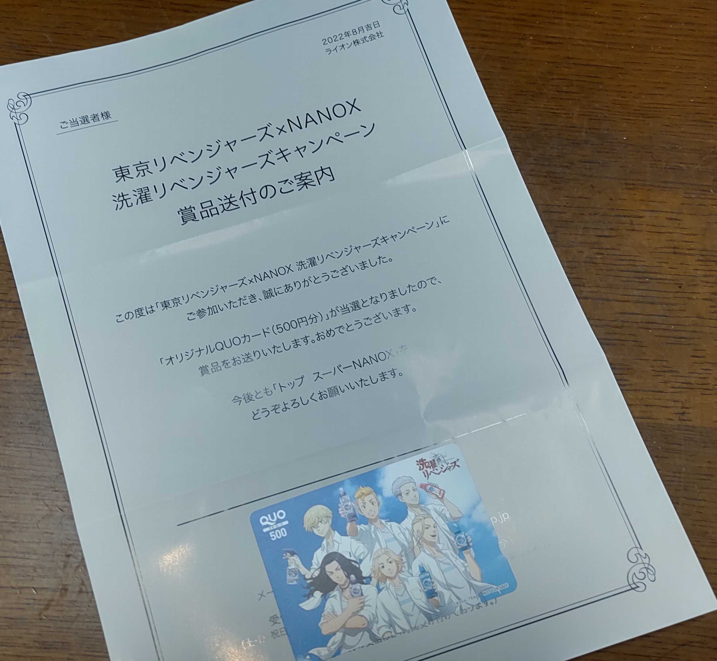 9/2 簡易書留で届きました😉いつも使ってるにのちゃんのCFのライオンの紫のナノックスのレシートLINE応募です🎯🎁東京リベンジャーズ クオカード 500円分💕ありがとうございます💕