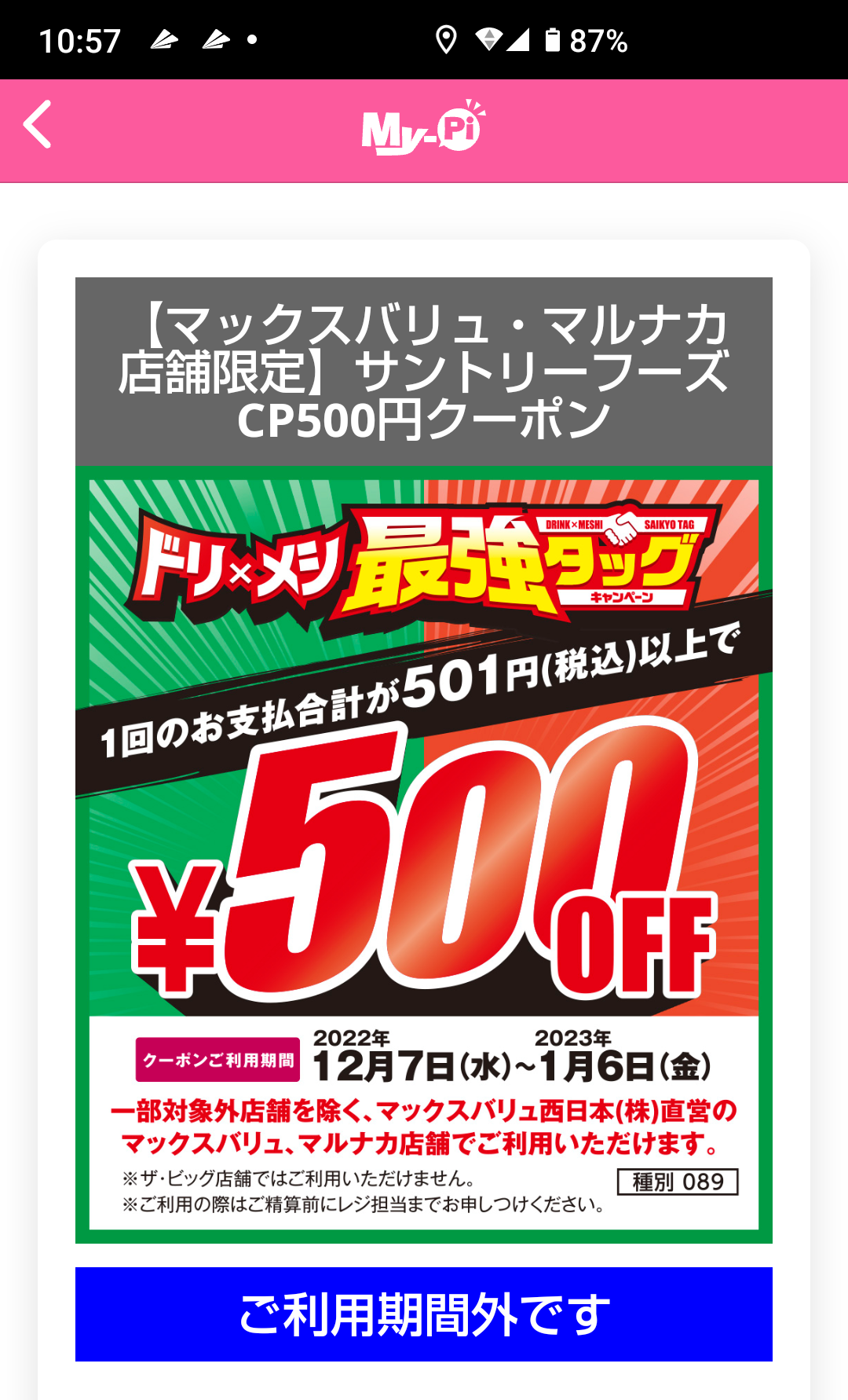 マックスバリュ西日本とマルナカでは『My-Pi』アプリ廃止へ。イオンのアプリ『iAEON』が使えるようになりました。新規にアプリをダウンロードすると特典があるようです。私はかなり前にダウンロードしてるのでこの特典はないです…🥴お気に入り店舗をイオン○店からマルナカ○店に変更してマルナカの割引クーポンが使えるようにしました。店員さんもまだ不慣れなご様子。明日は第2日曜日で5%オフですね。My-Piアプリの値引きクーポンはサッサと使い切りました😅