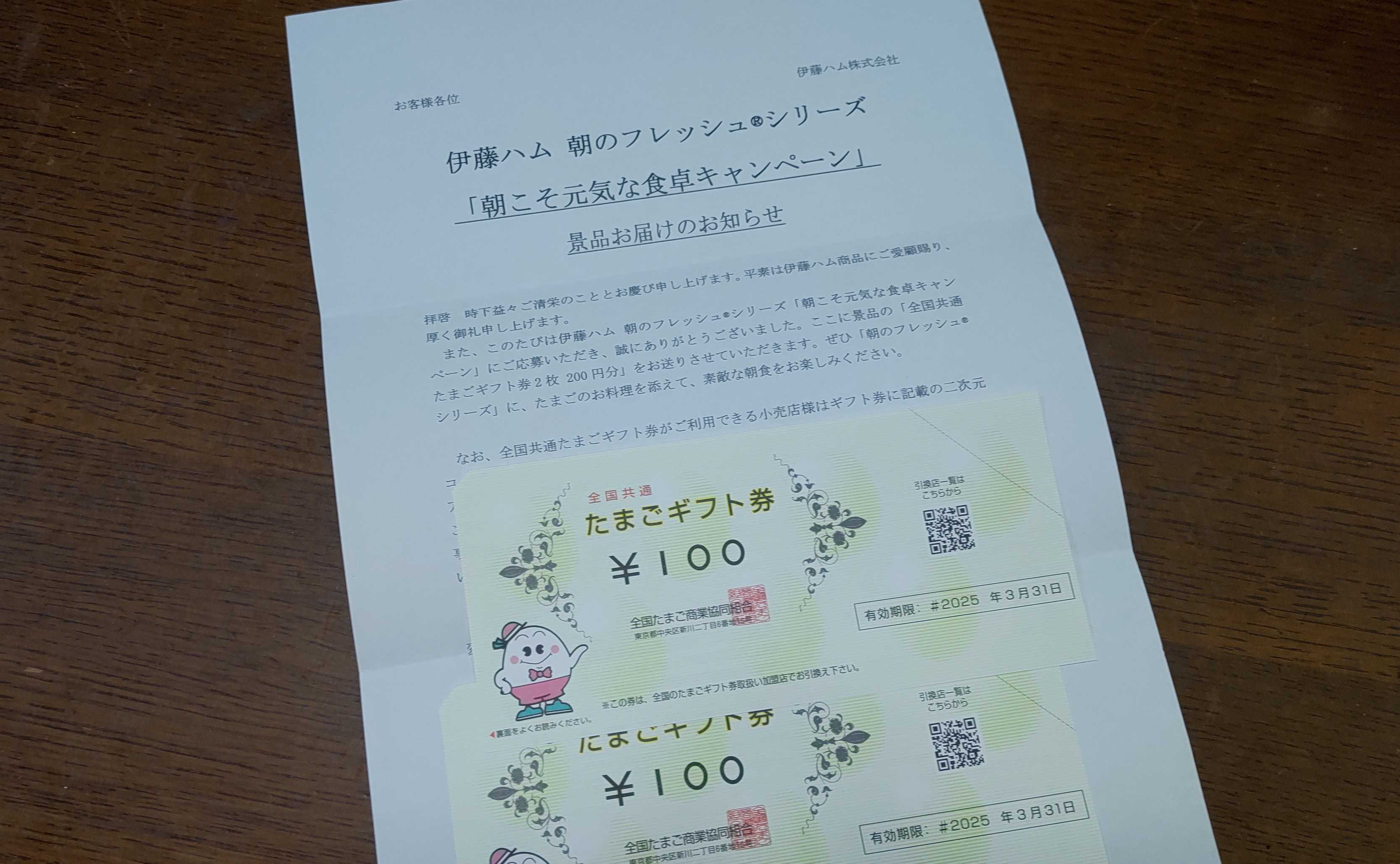 最近郵便物が多くて主に配当金ですけど懸賞系もありました😅先週 12/16 着 普通郵便🍀伊藤ハム朝のフレッシュの応募マーク6枚絶対もらえるコース🎁たまごギフト券応募控え全国区なのに当選数少ないね応募マークの消費で応募しました。鶏インフルエンザで卵も高騰とか…助かります🤑💕ありがとうございます💕
