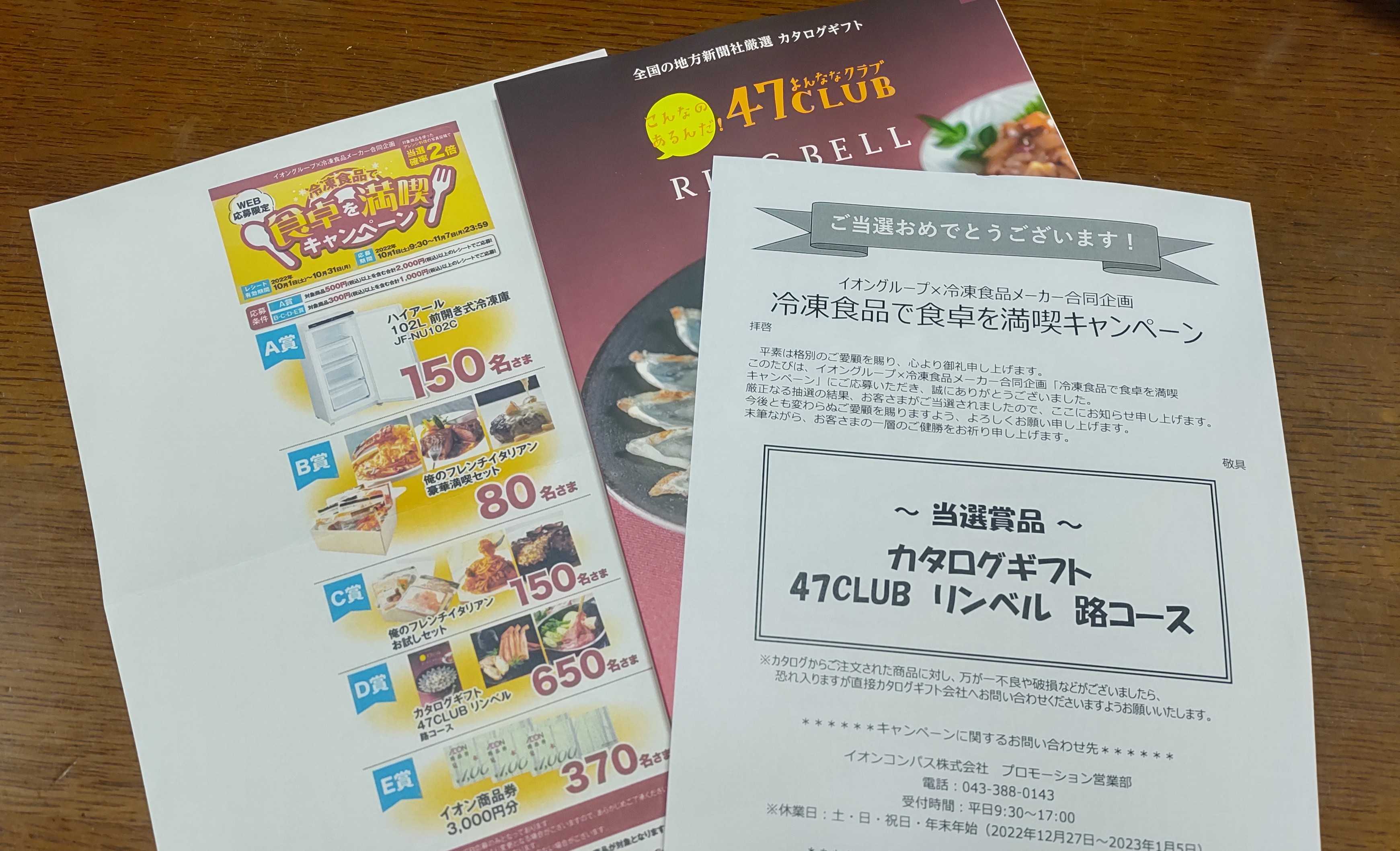 昨晩家に帰ったらレターパックライトで届いていました😉🍀イオングループ×冷凍食品メーカー合同企画『冷凍食品で食卓を満喫キャンペーン』🎁カタログギフト 47CLUBリンベル路コースいつもはE賞 商品券狙いなのですがD賞 は、650名!当選者数が多いことに惹かれてカタログギフトに応募しました😅うどんとちくわの天ぷらのコラボ写メ付けてちゃっかり当選確率2倍コースで応募😸お正月に家族と相談して(たぶん、プチ喧嘩する…😵)商品を選びたいと思います☺️💕ありがとうございます💕