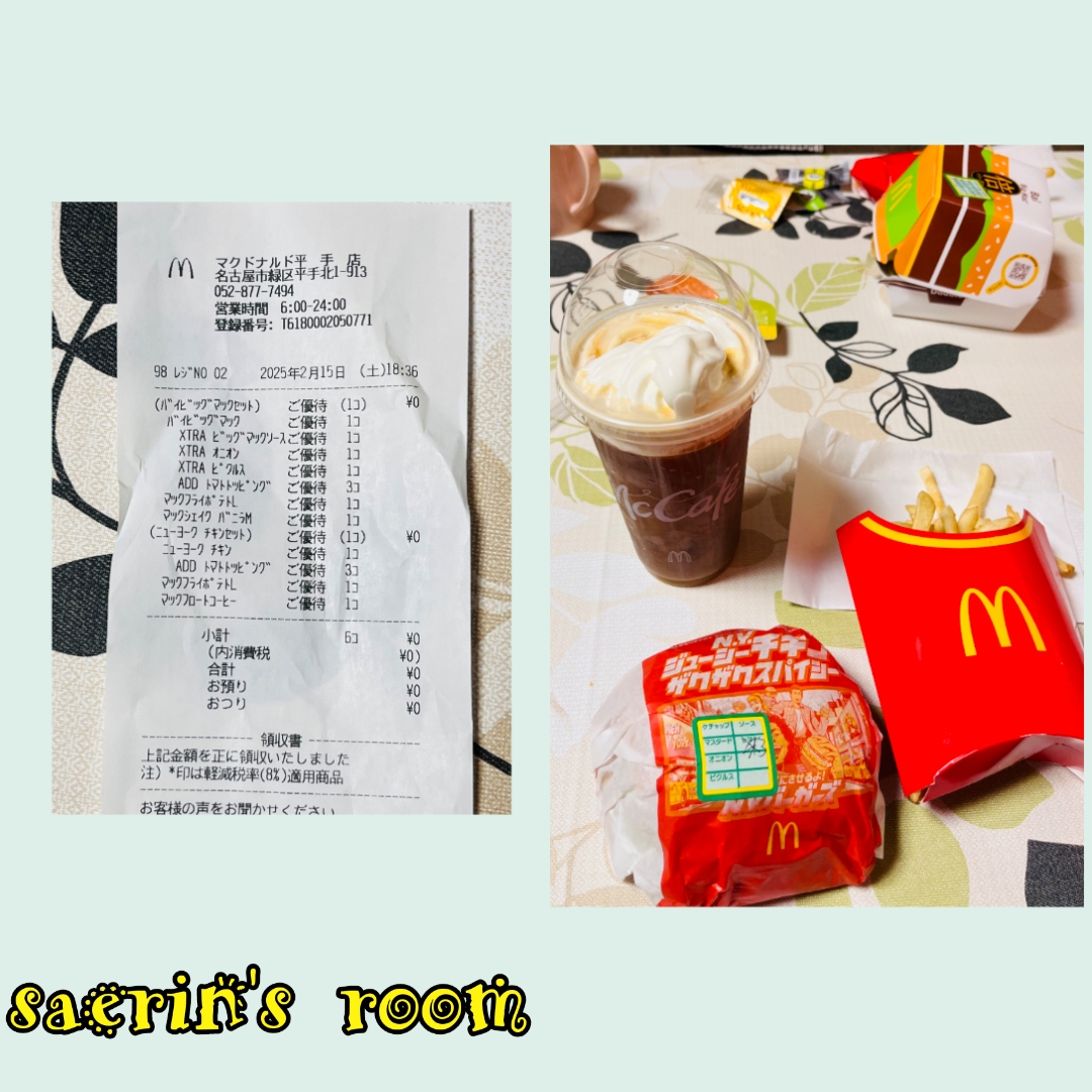 ​​帰りが夕方になってしまい疲れたので晩ごはんを作るのも面倒だなっと思っていたら、さえパパが「マックの株主優待券があるから夜マックをテイクアウトして家で食べようか??」と言ってくれたのでその提案にのりました!!久しぶりにハンバーガーが晩ごはんでしたが優待券でトッピングも無料だったのでパティ2倍+トマト+ピクルス+タマネギも追加してもらって超豪華でボリュームいっぱいのハンバーガーとポテトとシェイクでお腹いっぱいになりました(≧▽≦)​​