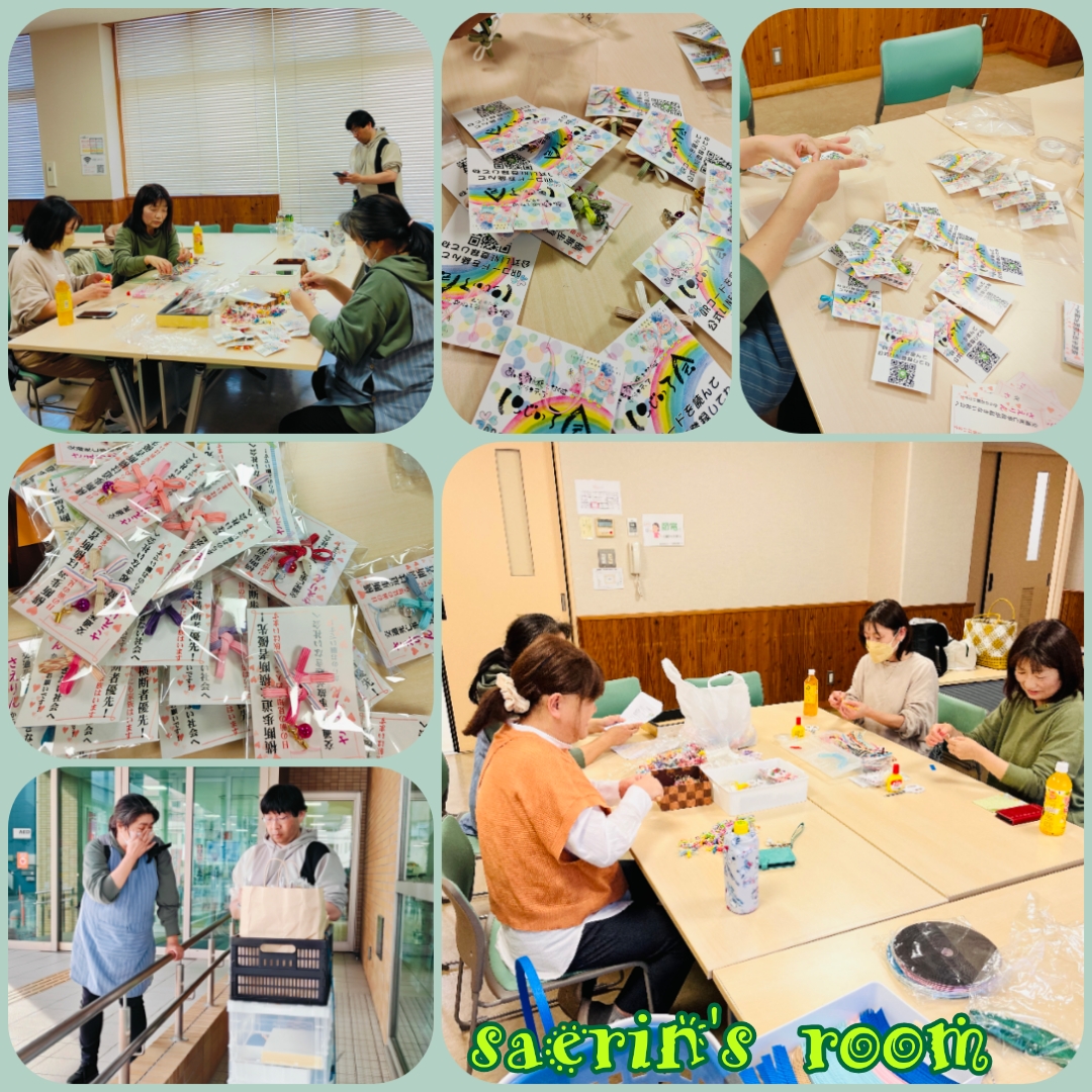 昨日はDさんとYさんとMさんの3人がきてくれてさえパパと私と5人でストラップ作りをしました。YさんとMさんはストラップを作る練習をして、私とDさんは花の形のパーツに紐と鈴をつけて袋詰めをして、さえパパはクラフトテープのカット作業をして最後には花編みパーツに紐と鈴をつけて手伝ってくれました。みんなお話ししながらも手は動かしてお蔭で途中からでしたが ストラップ300個完成しました!! 最近配布やお届けが多くて在庫が少なかったので助かりました。​​