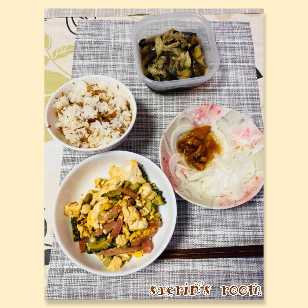 ​​ 家に帰るとさえパパが晩ごはんの準備をしてくれていました。今日はゴーヤチャンプルーと玉ねぎのスライスサラダと昨日の残りのナスの焼き浸しでした。先日豊明市のTさんが下さったゴーヤでとっても美味しかったです(≧▽≦)