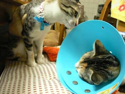 3月28日 とわの避妊手術当日の樣子をお伝えしようと思います。当猫不在だった為、画像少・文字多の日記になると思いますのでお時間に余裕のある時にご覧ください。--猫は予知する?当日は夜明け前から起床時までなぜか異常に甘えモード。布団の中でぴったりくっついて離れませんでした。起きた時 ままがこんな時間からお出掛け服着てる!やっぱりどっか行っちゃうのかな!?お出掛け気づかれちゃったかぁ。 でもままー。それよりね、何か忘れてない? きのうの夜から・・・手術前は絶食になっているので昨晩は「ハラ減ったコール」を無視し続けました。ゴメンヨー(。-人-。)それからままーも朝ご飯を我慢してとわを連れて病院へ。(ヤな予感的中!や・だーーーっ!)と、リュックの中でもがいておりました。9:00 問診・触診・聴診・検温・手術に関する誓約書にサインを済ませ入院 ままー 一旦帰宅遅めの朝食を摂りながらブログを書いたりサンと遊んだり。 ちょっと寂しげ14:30 病院から「無事終了」のTEL有り。 良かった~ (*´∀`)--病院に響く絶叫17:00 お迎え。 本当は開診時間(16:30)に行きたかったが、にぃにが車を 使っていたため遅れる。道中、抜け道に入り忘れたじぃじに 悪態をつくままー。自分が紙ドライバーだということを 完全に棚に上げている。夕方の病院は混んでおり、じぃじと猫雑誌をめくりながらしばらく待つ。・・・・・・・・・と。ぎにゃーっ びゃーーっ ぎぃーーっっ酷い叫び声が待合室を一瞬凍らせる。「猫やなぁ。ひどい鳴きようやな。」「まさかとわちゃうよなぁ・・・」「ちゃうやろ、あの声は」「そーやな。」ぎゃーん! びぃぃーー! ★★★★★!!!「可哀相に。めちゃ怖がってるやん」「ま、ままーさん、お待たせしました」・・・・!!! やっぱりとわやったんかいっっ( ̄△ ̄;|||先生と看護主任さん、二人掛りで保定されてお出ましでした。。。術後の痛みと先生へのトラウマで体も心もズタボロのとわ孃。ひどくご乱心で、ままーも一噛み頂きましたヾ(・ω・`;)オチツケー しばし放心状態。とーちん、お疲れ様。すんごい鳴いてたね。 えっとね、「やめんかゴルァ!頭スコーンと割ってストローで脳みそちゅーちゅー吸うたろか!!! 鼻の穴から割り箸突っ込んで下からカッコンすんぞワレぇ!!! コンクリート詰めにして南港に沈めんどォ~!!!」って言うたった!あ~怖かった!!・・・・・・・・・・・・・(;゜∀゜)b え、未知やすえさん ご存知ない!? 超有名女優さんですよ! 吉本新喜劇の明日、「少女時代最後の日 とわ編 後半」につづくびゃーっと1クリック その優しさが励みになりますm(_ _ )m 落ち着いてからもう一押しっ(。-人-。) アリガトウゴザイマス :*:・(人*´∀`)・:*: 一人でも 意外と ハッスル♪ 携帯の方はコチラから。 サン&とわ&ままーは楽天アフィリエイトに 参加しています。 我が家の二匹は里親サイト「いつでも里親募集中」からやってきました。アフィリエイト で得たポイントは保護猫活動をされている団体に寄付したいと思っています。 獲得ポイント、寄付報告は随侍UPしていきます。