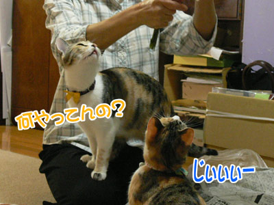 今日も晴れて暑いくらいだったので。ついに。ご姉妹を生まれて初めて洗濯してやりましたー! ザッパーン!! 洗われた! 洗われたっ!! 何! 何っ!? *←とわ猫をシャンプーするのは、実は3回目です。1回目、2回目はそれぞれ先々代、先代の猫がままー家に迷い込んできた時。二回とも、猫は訳も分からずに濡らされ泡立てられで、鳴くわ喚くわ引っ掻くわで激しく抵抗!じぃじと二人、流血必至で挑んだので、今回も内心ビビリながらの挑戦でした。猫は元々キレイ好きだし、自分で舐めてケアしてるから無理に洗わなくてもいいかな、とも思わなくもないけどー・・・、でもご姉妹は外で散歩もするし・・・。嫌がりそうなことは子供の頃に慣れさせておかないと後々大変になるし・・・と思って、換毛期も収束しつつある今日をX-Dayにしました。で、どうなったかと言いますと。写真を撮る余裕こそなかったものの、サンもとわも意外におとなしくて、多少逃げ腰になったり、イヤーンと鳴いたりしたものの、ままーが拍子抜けするほどお利口さんに洗われてくれました。 なんてイイコちゃんなんだ・・・(T▽T)カンドーしたっ!!ご姉妹よぉ~、イイコだったねぇ~☆ ご褒美あげよーねー・・・ って、あっ!!? シバ! シバ、シバでしゅ!! *←サン早い早いっ(-"-;A ちゃんとお皿に入れてから!! 肉体疲労時の回復にはリポD、精神疲労時の回復にはシバが一番でしゅ!! *左サン 右とわ頑張って辛抱した後だから、二匹とも当然ガッつくかと思いきや。とわは・・・ 何故か 食べては、 ウマ ウマー カリカリカリ・・・ 考え、 ・・・・・・・。 また食べては、 カリカリカリカリ・・・ しばし停止。 ・・・・・・・・。どーした? まだ残ってんぢゃん。そんなことしてたら・・・あ。 あれー、とわちんの方が多くもらったんじゃないでしゅかー? え、と。そんなこと ない と 思うケド。。。 ほら まだこんなにありましゅ。 あ、うん、ちゃんと食べるよ アタシ えー、仕方ないから手伝ってあげましゅよー え、えぇっ!? あー・・・ やっぱシバ サイコーでしゅ!ね☆ (*´-д-) こんのぉ~おチビーーーっ!! ままーが作ったゴハンにもそれくらい執着してよねっ!!!シーバにかかると見境がなくなるサン、意外にアッサリ譲っちゃうとわ。なんか不思議。シャワシャワアワアワポチッとクリック! m(_ _ )m シバシバウマウマポチッともう一押しっ(。-人-。) アリガトウゴザイマス :*:・(人*´∀`)・:*: サンのシーバに対する執着の証 二人で1袋の予定が、強い要望により一人1袋に・・・(涙)*こんなコンテストがあったので応募してみました。 心温まる写真ばかりです。覗いてみてくださいね。('∀') ☆サン・とわの写真はNo.228~No.232にあります☆ ちょっと分りづらいですが・・・ サン&とわ&ままーは楽天アフィリエイトに参加しています。 我が家の二匹は里親サイト「いつでも里親募集中」からやってきました。アフィリエイト で得たポイントは保護猫活動をされている団体に寄付したいと思っています。 獲得ポイント、寄付報告は随侍UPしていきます。