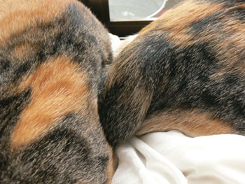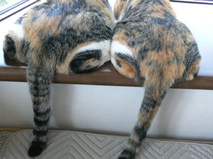 < 第1.5回 サンとわ検定 > の答えを発表する前に、今日も軽く準備運動を一発。 Q.これ、どっち が どっち? チッチッチッチッチッチッチッチッチッチ・・・・・・・・・・ 時間でーす。 A.でした~。すみません、「軽く」なんて言いながら、ままー家でも不正解者続出レベルでした。( ̄ε ̄;)では、改めまして、昨日の答えです。 どどん。 なので、[Q.とわはどっち?] 答えは[ 左 ]ということになります~(*゚∀゚*) この写真は[左サン・右とわ]です。 見分けポイントは、配色、長さ、太さ。・サンは茶色多目、縞模様ぼやけ気味。とわは縞模様はっきりめ、先っぽ真っ黒。・長さ…サンめちゃ長29cm 、とわやや長26cm 。サンの尻尾はどこまで成長するんだろう・・・・太さ…サン ひょろり、とわ しっかり。あと、写真では伝わりませんがサンは常にピーンと上向き、とわはタラーンと垂れ気味(笑)なんとなく同じに見えて、どことなく違っている。 そんなご姉妹です。( ´艸`)ウフフポチッとクリック! その優しさが励みになりますm(_ _ )m 今日は暑かった・・・ もう一押しっ(。-人-。) アリガトウゴザイマス :*:・(人*´∀`)・:*: んー、 窓辺さいこー。--以下 本題----- さて・・・。タイトルの件です。 母猫代理、つまり勿論ままーのことなんですが、今日、私の認識の甘さから、とわを危ない目に遭わせてしまいました。。。今日は全国的にめちゃ暑のお天気でしたよね。大阪も朝からピーカンに晴れて、「夏休みかよ!」くらいの空が広がっていました。とは言えいい感じに風もあり気持ち良かったので、私はとわを連れてホームセンターにカリカリを買いに出掛けました。結果、初期症状で済んだもののとわを熱中症にしてしまいました。。。私は、猫はある程度暑さには耐えられる動物だと認識していました。ホームセンターへはサン・とわのどちらかと一緒に行くのは毎度の事で、ただ今日は陽射しが強いしいつものリュックだと猫も暑いだろうと、綿のトートバッグに替え、氷水入りペットボトルをタオルで巻いたものを入れ、ハーネスもやめてリードだけにしました。とわは開口部が広いバッグで充分風を受けながら景色を眺め、行きは上機嫌でした。でも、買い物を済ませ帰り途中、甘えるような声で鳴いたりバッグから出ようとしたり。今思うと少し樣子がおかしかったです。帰宅した途端とわはべたーんと横になりました。家で待っていたサンが私に「お帰り」もせずにとわに駆け寄っていって舐めはじめました。ここで初めて私はとわの呼吸が異常に早いことに気が付きました。甘かったです。 こんなに暑い日の真っ昼間に・・・。一般的に猫が暑さに強いとはいえ、個体によりけりです。しかもサン・とわは一才にもなっていないまだまだ仔猫なのに・・・思慮が浅すぎました。慌てて、口呼吸しているとわにスポイトで水を飲ませ、絞ったタオルを体に掛け、肉球や鼻や耳の後ろを水で湿らせました。幸いこれ以上症状は進まず、数時間で元気なとわに戻りましたが、しんどそうにハァハァしているとわを冷やし続けながら猛烈に反省しました。熱中症は、炎天下や締め切った室内だけで起こるわけじゃない。本格的に夏が来る前に認識を改められてよかった。。。とわ、ままのせいでしんどい目に遭わせて本当に本当にごめん。今日のことを反面教師にして、ご姉妹が夏を出来るだけ快適に過ごせるように勉強します。母猫代理1年目ままー、まだまだ未熟です(ノ_・、)