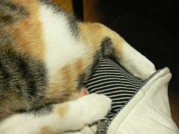 月齢8ヶ月のオンナノコにしては・・・ がっしりとしたリッパな おみ足、 存在感のある オシリ、、 ムチムチグラマラスな ボデー、、、 渋い表情は やや 中井貴一さん似、、、、 ・・・・・というこのヒト、 いえ。。。今日はお昼過ぎまで雨がザァザァ降っていたので、家の中でマッタリ遊んでいたのですが、(写真は晴れた日の外散歩の時のです)雨が止むと、「お外連れてけー!連れてけー!」と二人してうるさいモンですから夜になってから一匹ずつ順番に、抱っこで近所を一周ブラブラ歩いてきました。とわもサンも肩乗りスタイルや抱っこスタイルで上手にお散歩出来るのですが、帰ってきて、フとTシャツの襟元を見ると、、、あ、 穴 がっ。 。 。 (゜д゜;)ガーン!!!!とわぁ~! おめぇー、でっかい体 支えるためにどんだけしがみついてたんだYO (>_<)!!キレイに4つ、爪の跡だと思われる小さな穴が開いておりました・・・涙え?サンの疑いはないのか ですって?だって、ホラ。 サンちゃんてばこんなにスラリとしているでございましょ? バランス感覚も良くて、しがみつかなくてもちょこんと肩乗りできるのでございますよ。あ、だからって・・・・、「疑わしきは ホニャララ・・・」 ですよね。うん、そーだ そーだ。 決め付けちゃぁ いけない。だから。。。ままーの洋服がこれ以上シースルーにならないようにダイエット頑張ろうねo(T_T)o!!シースルーになってセクスィ~クリック! いやいや、穴ぼこ ビンボークリック!(。-人-。) アリガトウゴザイマス :*:・(人*´∀`)・:*: デブ って言いたいんでしゅね☆いやいやいやいや。いやいやいやいや。。。 時には俊敏機敏。 ヨシモトのワタナベナオミのように。。。 虫 とったどーっ!!*こんなコンテストがあったので応募してみました。 心温まる写真ばかりです。覗いてみてくださいね。('∀') ☆サン・とわの写真はNo.228~No.232にあります☆ ちょっと分りづらいですが・・・ サン&とわ&ままーは楽天アフィリエイトに参加しています。 我が家の二匹は里親サイト「いつでも里親募集中」からやってきました。アフィリエイト で得たポイントは保護猫活動をされている団体に寄付したいと思っています。 獲得ポイント、寄付報告は随侍UPしていきます。