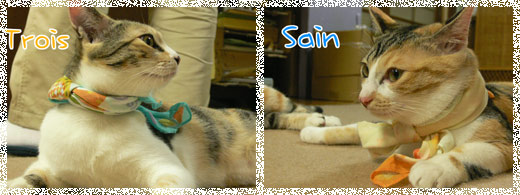 今日のご姉妹はCAふう。(ままーがちびっこだった時代はスチュワーデスさんって言ってたんですけどねぇ・・・) なんでスカーフ(というかハンカチだけど)なんか巻いているかというと、ノミ対策のフロントラインを首に垂らしたから。互いに舐めてしまってはいけませんからね。まぁ、せっかくなのでCA的コントでもお願いしましょう。はい、すたーと。 そういうおごりが失敗や失礼を招くんだから! がんばってもがんばっても叱られるばっか。もういいでしゅ! 円周率が3とか、ありえないんだからっっっ!確かにね~。そんなにゆとらなくても。 ねぇ~。。。 アテンション ポチ~ッ(* ̄ω ̄) サンキューフォービジッティングサン&とわ&ままー☆ プリーズ カム アゲイン トゥモロー★ アリガトウゴザイマス :*:・(人*´∀`)・:*: お仕事終わりで合同休み!ままー的「CA」は、本日のトップニュースに対して・・・。C・・・茶番かよ、A・・・アホくさ。。。C・・・ちゃんとやれよA・・・アンタら てな感じですかねー。政治について熱く語れるリッパな国民ではありませんが、ちょっとひどくね?と思ふ。*こんなコンテストがあったので応募してみました。 心温まる写真ばかりです。覗いてみてくださいね。('∀') ☆サン・とわの写真はNo.228~No.232にあります☆ ちょっと分りづらいですが・・・ サン&とわ&ままーは楽天アフィリエイトに参加しています。 我が家の二匹は里親サイト「いつでも里親募集中」からやってきました。アフィリエイト で得たポイントは保護猫活動をされている団体に寄付したいと思っています。 獲得ポイント、寄付報告は随侍UPしていきます。