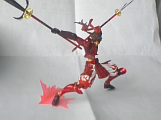 武田男祭りというわけで、戦国BASARAリボルテックより真田幸村です。伊達正宗と同日発売なのですが、正宗の紹介からかなり間が空いてしまいました(悲)まずセット内容から参りましょう。朱羅2振り、連結時槍パーツ、エフェクト付展示ベース(赤色)、汎用ベース+延長パーツ、武器保持用左右拳。リボコンテナ。初回生産版は槍の先がメッキパーツになっています。正宗に比べるとやや武器が少ないように思われますが意外と槍のボリュームがあります。また、後ろ髪とハチマキが別パーツになっており表情付けができます。意外に長髪だったんですねえ。パッケージの見本写真のポーズリボ球をうまく使うとハッタリの利いたポーズができます。一旦リボを引き抜いてポーズ決めするのが正攻法のようですな。みのるは、ブリスターパックから出すや否や左肘をポッキリやってしまいました。リボの初期配置位置が左右に曲がるようになっていたのが原因かと。リボは意外にもろいです(泣)軸が中に入り込んでしまったので修復は困難でした。固定フィギュアならまだしもアクションフィギュアの可動部は接着剤で直してもムダだろうというわけで、ダメもとでメーカのお客様窓口に連絡。意外にも対応が良くて、早速無償で左腕一本を送って下さるらしい。いい会社だ。リボルテックが売れる理由の一因でもあるのだろうか?購入確認はしなくていいんか?とか疑問でしたが、商品自体を持っていないのに腕だけもらっても意味ないのも事実。肩のリボを除き拳まで付いてきたので予備ができました。結局、破損したパーツも取り除いて修復できましたが、やはり動かすと取れてしまいます。紅蓮脚のポーズ。ゲームをやった方ならすぐにわかりますよね?欲を言えば、槍とか足とか拳に付けるエフェクトパーツがあったら良かったです。鉄棒とかにみえなくもない(笑)空中で前転しながらタックルする朱雀翔という技もあるのですが、分かりづらいのでやめました。正宗のHELLDRAGON(雷球発射する技)もそうなんですが、最終技の火炎車(火達磨になって回転する技)にはエフェクトパーツがあると良かったかも。当初正宗だけ買うつもりでしたが、やはりライバルがいないとつまらんというわけで買いました。早期購入するとはメッキパーツの他に、PSP版イラストの描かれたリバーシブル下敷きがもらえます。展示背景用にいいかもしれません。僕が買ったエイデンでは1980円で売ってました。事前にキッズランド(ジョーシン電機)などにも確認しましたが知ってる範囲では最安値でした。そのせいか結構売れてましたね。ちなみに1月にはプロショップ限定で、白版も発売されます。クイーンズブレイドの2Pカラーのように附属品は増えないのでスルーの方向で。いやあ、男キャラのフィギュアで燃えたのは久しぶりでしたね。普段ブリーチとかガンダムキャラしか買わないもんですから。