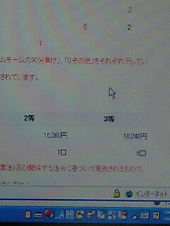 最後の千葉ー横M戦 買ったのは1でしたが後半43分巻のボレーシュート!やった!神様はやっぱりいるんだとおもったつかの間 ロスタイムの坂田のゴール。やっぱり 世の中そんなもの。この前のトトゴール時と一緒でした。当ってれば30万以上にはなったでしょー金額は少ないが2等よりはましです。かなしいです。久々の1等とおもったんだけど。ちなみに当てたのは4年前ぐらいでVゴールあった時代だから引き分け少なく1万くらいだったなー。なつかしー