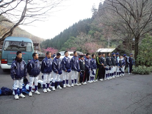 ボーイズ少年野球、九州大会 由布市 (4月9日)湯布院にて朝の出発の 挨拶を頂いているところです涙もろくなったスタッフが 頑張ってね!とお見送りをしています。