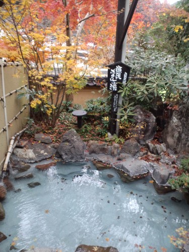 温泉の屋根や湯気のせいでしょうか ここだけはまだ 紅葉が見られます朝夕温泉に入って足早に行った 秋を偲んでいます
