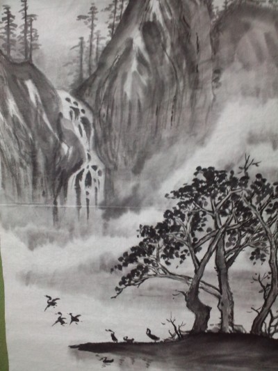水墨画教室で 学ぶ技法の他に自宅で毎日コツコツと描いて そして教室で批評していただく事を 楽しみにしています先月から先生の考えたれた 留白樹法で全紙に描いてみました まだ始まったばかりで恥ずかしですが、これをマスターできれば、私の故郷の 九重の飯田高原の雄大な景色を描いて屏風を作りたい、、そんな大きな 夢を持って孤軍奮闘中です