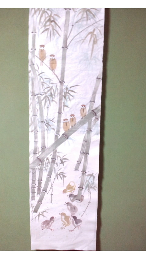 先月の日本画教室の 竹に雀とひよこの絵を描き上げました。慣れない技法に 四苦八苦しましたが、どうにか作品になりました。次回は何の画題の勉強かしら、、