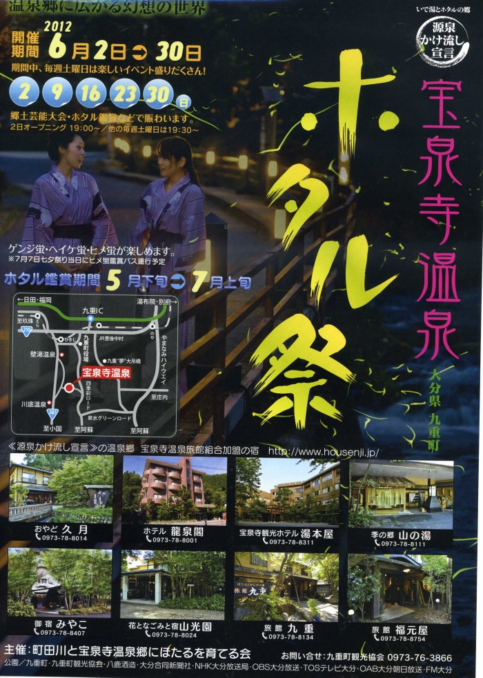 後一カ月余りで 宝泉寺温泉の 蛍祭りです!チラシも出来上がって 宣伝活動も始まっていますこの時期は私達にとって 一番嬉しい時です。ほたるに会えたお客様は とても感激されて小さなスターたちにロマンを感じていただけるからです 過去に 私が書いた “蛍のロマン”を下記にリンクします。どうぞご覧になって下さいませ。http://www.sankouen.jp/okami/oenka/hotaru01/hotaru01.html