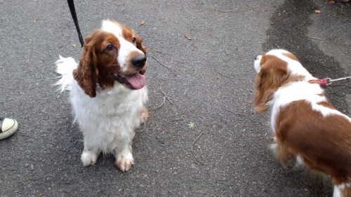 4月22日お泊りのワンちゃん Y様家の アンジーちゃんウエルシュ.スプリンガー.スパニエルと言う初めて見える犬種で とても楽しみにしていました温厚で優しく、それでいて遊ぶ時は熱狂的になってくれます。すみれとは 毛の色がそっくりで、すぐに仲良くなれて本当に可愛かったです。 S様家の さくらちゃんは 初代看板犬のももこにそっくりでした皆で奪い合って抱っこさせてもらえて とても 嬉しかったです。 Y様より 「以前キャバリアを飼っていた時の思い出の品です どこかに飾ってください、、」と可愛い置きものを頂きました。早速 玄関先で 皆さんをお迎えしています。
