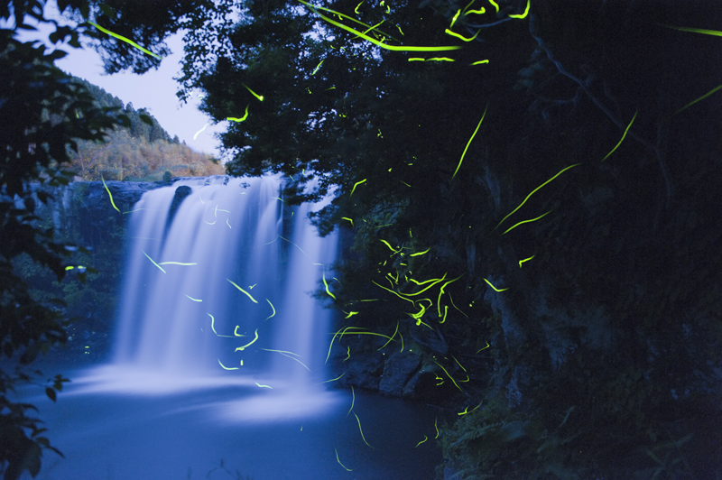 他の用件で Kさんに電話をしたところ「今山光園の近くの仙洞の滝壺にいてホタルの写真を撮っているよ!」とのこと 早速若女将と滝に向かいましたあわてて持ていった懐中電灯はうまく点かなくて階段の降口から 大声でKさんを呼んで迎えに来てもらう始末、暗闇の仙洞の滝のしぶきをバックに無数の源氏ボタルが 乱舞している様は とても神秘的でした 滝の流れの中に引きこまれて あわてる蛍もいます蛍の光に照らされた 滝の流れがとても素敵に見えます 脇の方にカメラを設置して撮っておられました私達にはとても撮れない、プロの技術をお持ちの方です「画像 送って下さいね!」とお願いして帰りました。 早速添付していただいたのが上の画像です滝と蛍が こんなに近くで見られるなんて とても嬉しくなりました。 明日の夜また仙洞の滝に行って見ようかしら、、