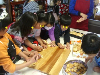 年に一度のクッキー作りを、今年も楽しく生徒と行いました。去年は人数が多すぎて、ハチャメチャ・・・今回は制限をして30人で・・・・こんなこともあろうかと、(実は言い訳・・)昨年の秋、大奮発してガスオーブンを買っちゃたのよ~ん。やはりガスは、はやっっ オーブンレンジ2台もフル稼働しましたが、とてもとてもガスにはかないません。頼もしい助っ人になってくれました。今回も大成功 ベランダのデッキと、キッチンとで2組に分かれてもらいました。 子供達は大喜び(お母様方も・・) さあ~て 私が腕によりをかけて焼き上げた美味しいスイーツをめしあがれ~ 慌てないで!!ちっちゃい子供からよ! 生徒さんや、お母様に喜んで頂けるよう二日がかりで作ったケーキです。 シフォンケーキ、クグロフマーブルケーキ、イチゴタルト、 ガトーショコラ、ブラマンジェ、プリンケーキ×2、イチゴムース、 写真にはないけど・・苺アイスも。