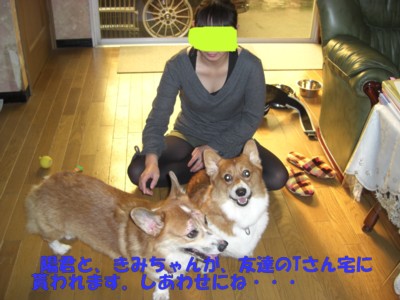 あるブリーダーが危機的状態で事業を続けられなくなり、どうしても犬達を手放さないといけない状況に追われているとの事でした。夫婦で、コーギーの繁殖を始めて10数年、犬が好きで好きで始めた事なのに・・・なんでこうなってしまったのか?。 今 抱えている子達は50頭近くいるようです。その中には、年老いた子達や下半身麻痺で車椅子の子もいます。そしてガンの子も居て現在 抗がん剤治療を受けているとも言っておりました。全て抱えてしまっているってことは、とても愛情深い方なんだろう・・・。とにかく、今後二度と 繁殖をしないと約束をした上で、協力する事にしました。この子達には 何の罪も有りません。幸せになってもらいたく譲渡に進めて行きたいと思っています。どうか 愛情を持って終生 家族の一員として迎えてやってください。それから 不幸な命を作らない為に 去勢 不妊手術をお願いしております。フィラリア予防薬の投与と 混合ワクチンも必ず接種していただけますよう宜しくおねがいします。//////////////////////////////////////////////////////////////////////// 友達のTさん宅に譲渡決定、本当にありがとう。ありがとう。10月31日 私の生徒のNちゃん宅に うずら君を家族として迎えて頂きました。わんぱく小僧のうずら君これからが 君の本当の人生いや・・犬生か?とにかく頑張れ・・・応援するよ。 11月11日にブリーダー宅から、譲渡先に決まった、もずくちゃん 陽君 きみちゃんの三頭を我が家に迎えました。三頭が それぞれL動物病院の好意で シャンプーや爪の手入れなどをして頂いて、見違える様に綺麗になりました。あくる日に 股関節の弱い きみちゃんが検査を受け、「深刻なほどでは無いが 股関節形成不全で、酷い痛みがあるため歩行障害が強い」と言う診断で、「注射とお薬で様子を見ましょう!」と言う事になりました。このままでは、きみちゃんを譲渡出来ません。そんなきみちゃんを、ブリダーに帰すなんて出来ません。よう君を引き受けてくれたTさんが、「この子も我が家に引き取ります。」との一言でめでたく行き先が決まりました。・・・・涙Tさんありがとう。よう君だけでも泣けるほど嬉しいのに・・・感謝です。よう君きみちゃん 幸せに・・・もずくちゃんは 今月21日に長野の里親様のもとへ 出発する予定です。それまで我が家で家庭で育てられる喜びや 少しのシツケを教えてあげるつもり。オモチャもおやつも 散歩も全て初体験何もかもが、新しくて何をするにも、おっかなビックリ。可愛いかわいいモズクちゃん・・・ もずく君 よう君 きみちゃん ご飯だよ。頑張って食べようね。 きみちゃん 庭で遊んでます。くりくりのお目目が可愛いね。 モズク君 歩く練習しようね、がんばれ~~ ヒカルと始めてのお散歩デビュー モズク君 何もかも始めての経験 もずくちゃん、「わたしボールで遊ぶの大好きだよ。」CIMG6264by ヒカル君 もずくちゃん ご飯だよ~ .........................................................................コーギー 1才 もずくちゃん 譲渡決定 長野県に行きます。 2才 メスきみちゃん 譲渡決定 優しい友達の所によう君と一緒に行きました。 2才 メス しろみちゃん 7ヶ月 オス あさり君 譲渡決定! 2006年7月31日生 メス カナちゃん 2006年1月9日生 メス でこちゃん 2007年11月30日生 メス ふたばちゃん 2000年2月11日生 メス あずきちゃん 2000年2月11日生 オス ぎんじ君 あずきちゃんと兄妹 2005年1月7日生 陽君 譲渡決定 友達のところに、きみちゃんと2頭一緒です。 2008年9月22日生 たまこちゃん 2008年9月8日生 すみこちゃん 譲渡決定三重県に行きます。 2才 ウズラ君 譲渡決定!全て 純血種のコーギーです。人間にはとてもフレンドリーで、イカクしない吠えない 噛み癖はなし。性格は大人しく温厚です。詳しくはV.O.Vのホームページを見てね