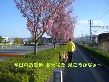 毎日遊歩道を通り 朝は散歩今年も綺麗なさくらが、8分咲き 満開にちかいかな~。 でも今年は ヒカル君だけ・・・さびしいなぁ~
