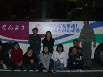 今回の身の毛もよだつ様な恐ろしい大地震、広範囲に甚大な被害が出ている現状で今尚 安否がわからない方達が大勢います。また被災地には、まだまだ物資が行き届いていない所が有るとの事で、支援物資も沢山必要です。テレビを付ければ毎日毎日悲しいニュースばかり、家族や友人との話も大半が震災の事。いつになったら明るさが見えてくるのだろうか?と、日々心を痛めています。そんな中、主人と何か出来る事がないか?と毎日の様に話し合い「5月2日~5日にかけて、被災地で、1000人分のぜんざいを被災者の方に食べて頂こうじゃないか」と言う事になりました。友人達にお願いをして車を出してもらう予定でしたが、なにぶん大量の荷物(支援物資も)人員とで3台の車と運転手が必要で、片道1000キロの道のりを考えると、運転手が六人要る勘定。「さてどうしましょう。」そこへ助け舟が。知り合いのNさんが、バスと運転手を出して下さる事になり一件落着。寄付をして下さる方、物資を出して下さる方、車を出して下さる方 様々な方の助けでやっと目鼻がつき、これからじっくり目的地の選定をします。 今回知り合いに、お借りするバスです。(観光バスの小型)Nさん有難う御座います。 被災されている方々に、いっぱい援助の手が届きます様に祈ります・・・