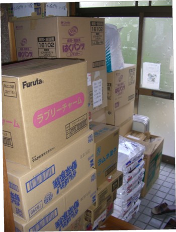 最初は、主人と話合い 福島の原発の近くに行く予定にしていましたが、現地に問い合わせてみたら、原発報道の加熱ぶりからか?ボランティアが殺到し、各地からの支援も充分との事で、取り止め ボランティや支援物資を受け入れる、宮城県亘理町に決めました。 原発から少し北に上がった所で宮城県の南端に近い所に有ります。 4月28日(木) 昼から、当日お世話になるバスに、炊き出し荷物と支援物資を積み込みに 行って来ました。(片道1時間10分) なんとなんと軽箱バン3台満タン・・・こんなに沢山積めるのかなぁ~みんな心配したましたが、さすが荷物整理のプロだわ・・(主人の事です)あれよあれよという間に見事に積み込んでしまいました。あっぱれもう少し物資が増える予定ではありますが、なにはともあれ一段落。後は 現地の担当者と毎日の連絡を密にして、5月2日(月)の出発日を迎える事となります。 無事に役目を果たし、みんなで無事に帰って来れますように・・・ 玄関に積み上げる支援物資 炊き出しのお餅や粒あん1050人分です。 車3台に炊き出しの品と支援物資を積み いざ出発・・ 到着してから直ぐにバスに運びます。 運んだ物資を仕分けしてます。。。。。。。。。。。。。。。。。。。。。。。。。。。。。。。。。。。。。。。。。。。。。。。。。