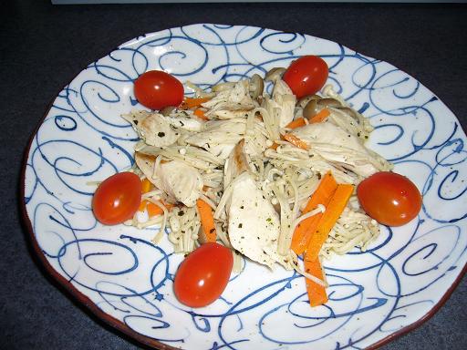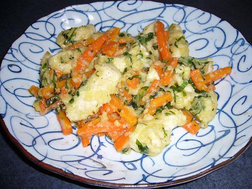 鶏のささみに塩を振り一口サイズにして小麦粉と青紫蘇を絡めてオリーブオイルで炒め・・・塩茹でしたにんじん・みりん酒・ほんだしを少し入れて水気がなくなったら出来上がりですこれなら・・・ささみもパサパサしなくてふんわりしっとりですにんじんとの相性もバッチリ ん~~~ ビールが美味しい あは