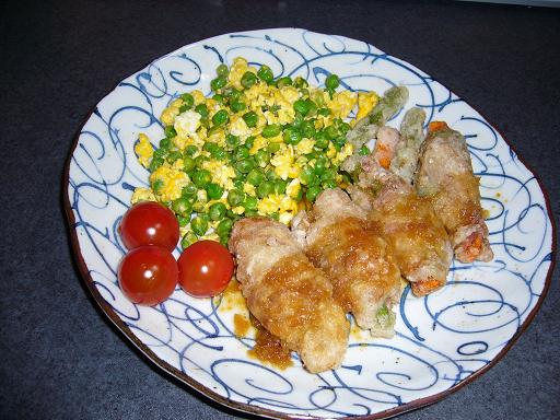 にんじんとアスパラを豚肉で巻きましたナスを2つの形に切り揚ましたえびとタマネギ・青海苔のかき揚げは ちょっと 失敗かな~味は良いです あは☆今日もビール(発泡酒)です