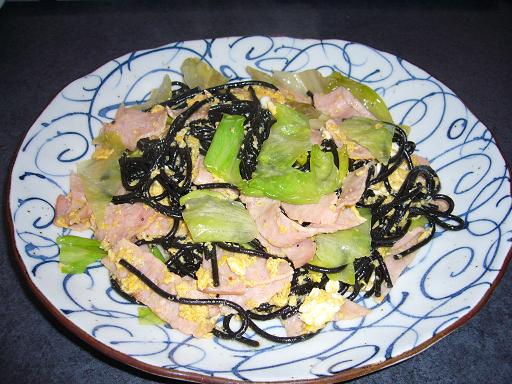 ワインが飲みたくて スパにしました材料はイカスミ入りスパ・ハム・卵・レタスです☆ハムをオリーブオイルで炒めて 卵を入れ 塩コショウ・ほんだし・みりん酒を入れて茹でたスパとバターを入れ絡ませたら 最後にレタスを入れ混ぜて出来上がり白ワインに良く合って美味しい~です久々のワインで 少し飲み過ぎかな~あは