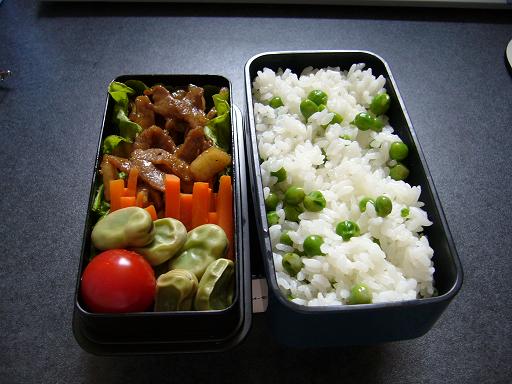 今日は 仕事が遅くなり そらまめの塩茹でとビールですなので写真はお弁当にしましたお肉は 豚肉のしょうが焼き風です冷凍グリンピースを塩茹でし 炊きたてごはんとまぜるだけ・・です あは冷凍グリンピースでも 甘くて美味しかったので大好きなグリンピースごはん 又作ってみたいと思います あは♪