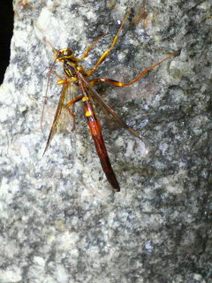 お墓まいりにいってきましたそのうちの一つのおはかに変わったはち?とんぼ?が・・・全長4cmほどだったかな?この生き物はなんなのだろう