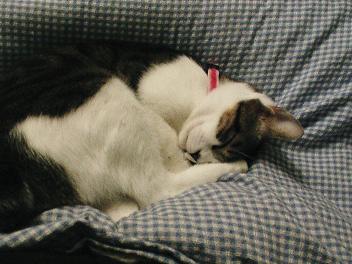 昨日の朝もそんなに激しく追いかけっこしていた訳でもないのにキャットタワーが倒れかけました。もう一刻の猶予もない気分になり、思わずヤフオクでの売上げもまだないうちから例のキャットタワーを注文しちゃいました(^_^;)普段は全然寝てばかりなんですがね~。なぜかコタツで座っていた私のところで寝はじめたョ(〃 ̄ー ̄〃) 手作り首輪のポイント。鎖編みしたウール100%の濃い目のピンク毛糸をフェルト生地に縫い付けております。今のところはまだキレイですが、おそらく1ヶ月後にはボロボロでしょう。普段抱っこが苦手のニャンコちゃんがくっついてくれるととても嬉しいものデス♪そして毎晩足元で寝てくれるのもまた嬉しいものデス。ということでヨロシクお願いします