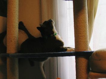 ふたりともかなりNEWキャットタワーを気に入ってくれているようだ。夜で更に画像が悪いので小さめにしたョ (^_^;)ゴムだけでも遊ぶニャンコちゃん ↑時々冷静になってテレビに映る猫を観察(ポチたま放映中)どこでもすぐ寝るお方。丸いのが猫背の彼にちょうど良いのか? ニャンコちゃんも興味津々のご様子。 今はその上の穴の所に座って窓の外を眺めているニャンスケ君。それにしても昨日の友人宅訪問以来、家の中のものが多い気がしてきた。やはり今年は気合いで家を改良しなくては!ということでヨロシクお願いします