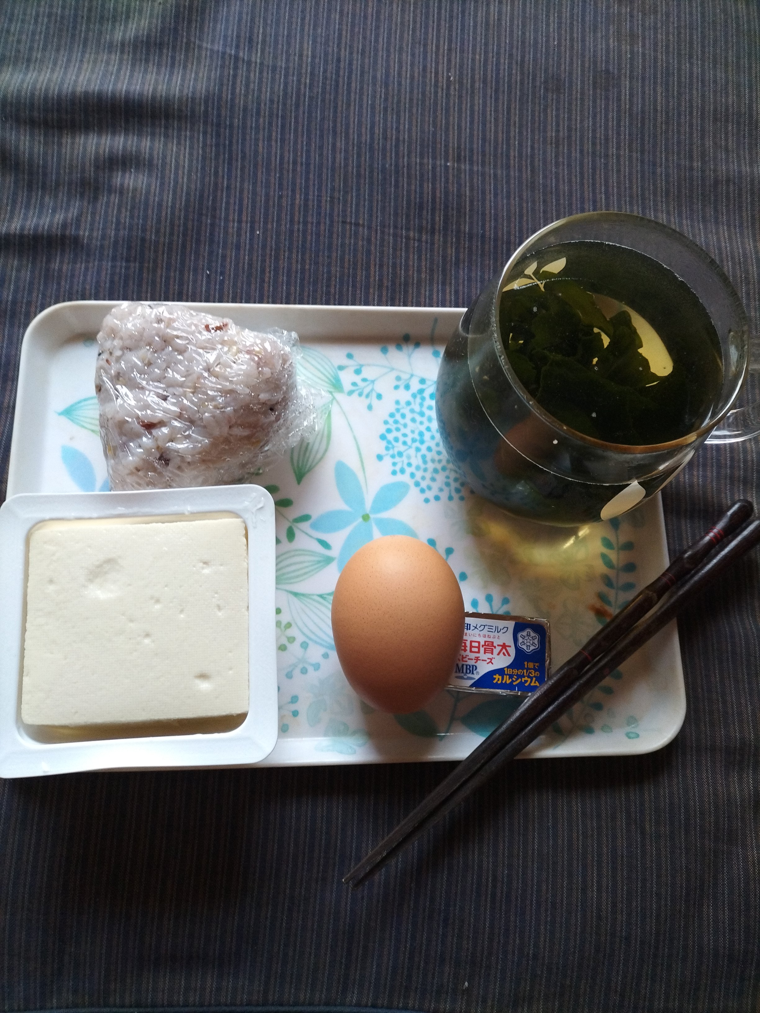 お昼ごはん雑穀米のおにぎり木綿豆腐ゆで卵チーズわかめスープ心療内科に行く前に、作っておいたおにぎりだけど、冷めても美味しかった😊💚#お昼ごはん