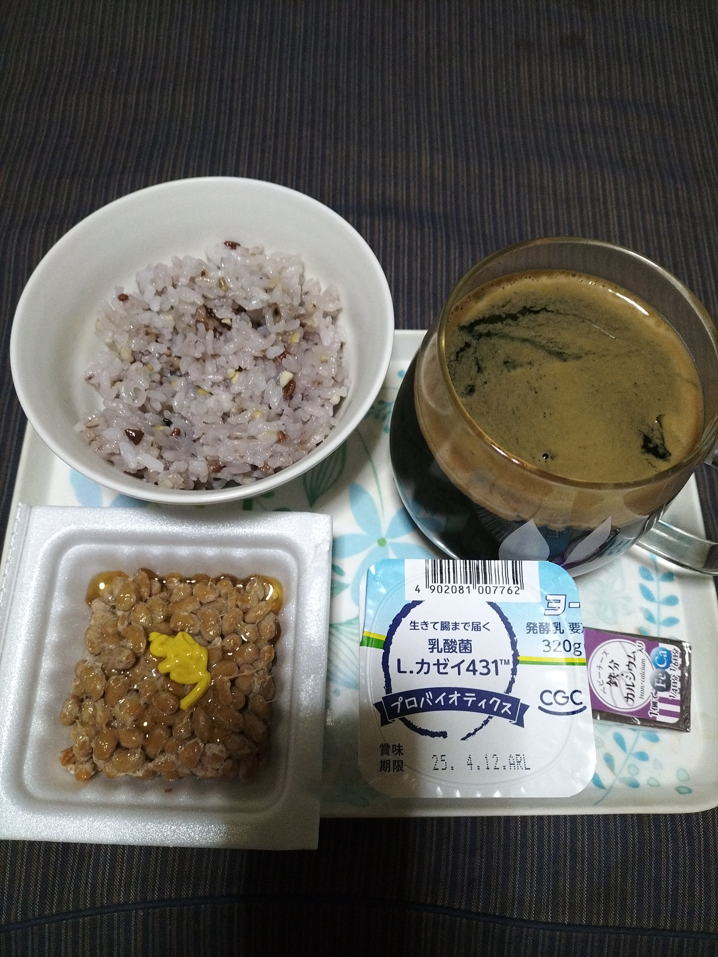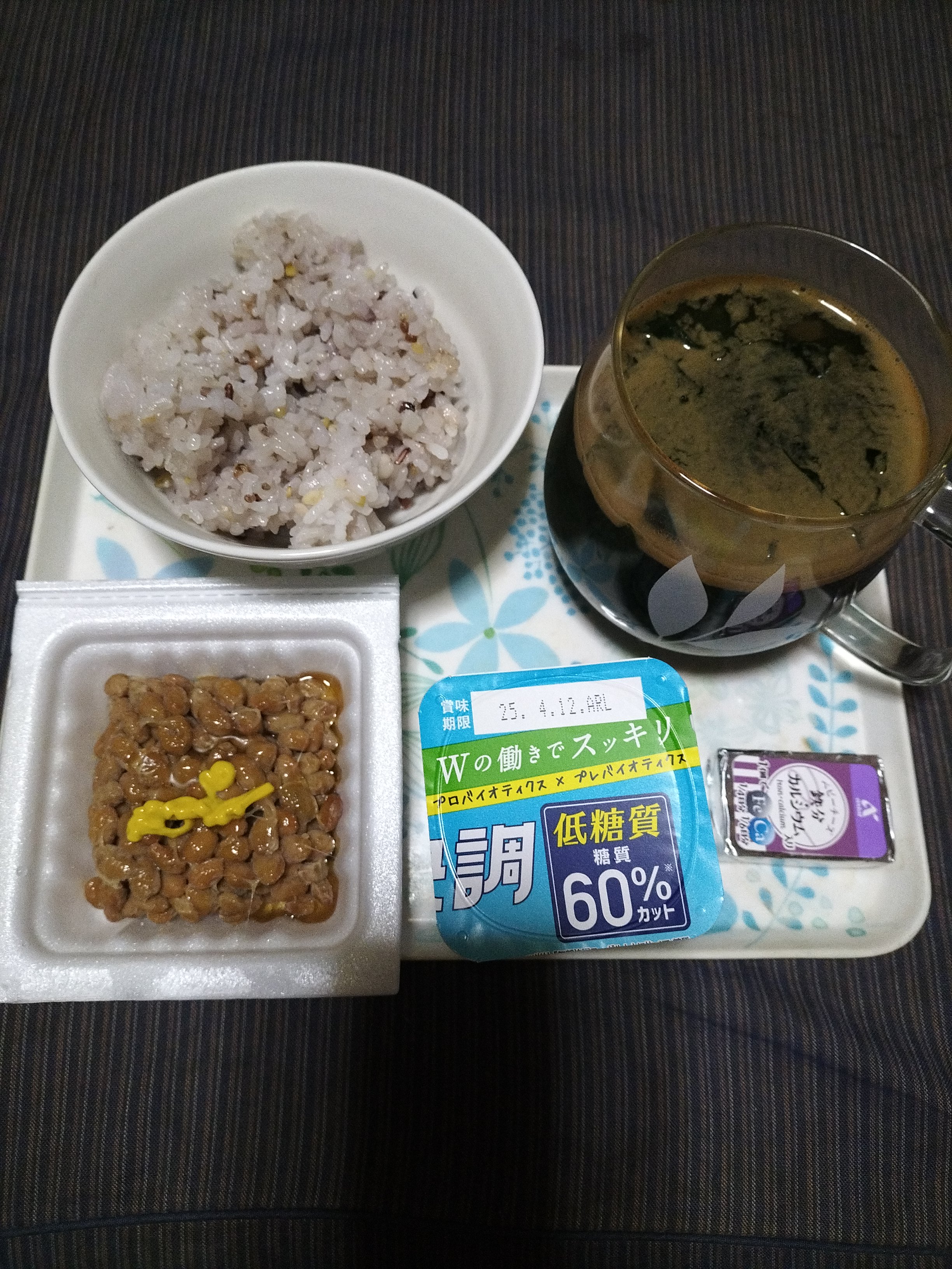 雑穀米納豆ヨーグルトチーズわかめスープ