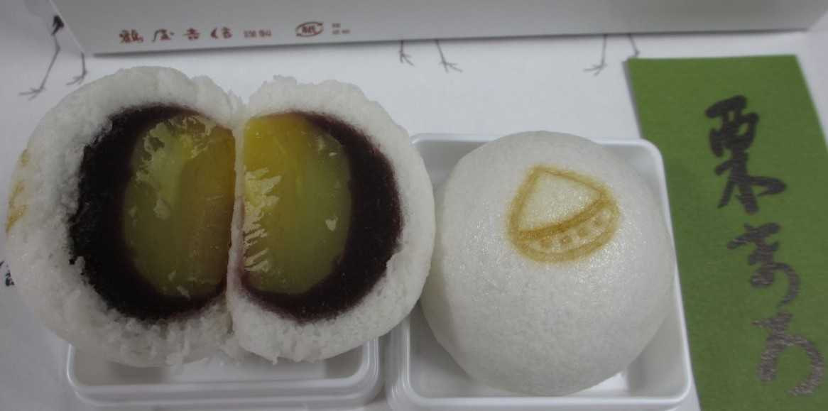 鶴屋吉信の秋のお菓子、栗まろ。蜜漬けの栗まるごと1個となめらかなこしあんを、丹波産…