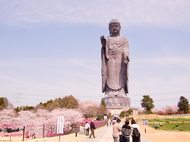 牛久大仏様の周囲には花がいっぱいです。今は、ちょうど「桜」の時期でそれはそれは艶やかでしたよ。その前に仏様は皆、蓮台の上に御坐します。牛久大仏の蓮台は異常に大きいので目の前まで行って見て来ました。これが蓮台です。大き過ぎてなんだか分かりませんねこの蓮台には参拝客が願いを込めて貼り付けた金箔が見えています。この四角の金箔を買い求めて大仏様の蓮台に貼るというわけです。信心の深さというか何かを祈願するというか記念なのか‥推察は出来ませんがここにいらした皆様の気持ちが分かるような気がしました。蓮台話はこのくらいで桜のお庭にまいりましょう。ピンクの芝桜とソメイヨシノのコラボレーションです。綺麗綺麗綺麗です。とても整然とした現代の池と庭ですが桜と芝桜の競演がとても愛らしくてキレイでした。なんの問題もなく美しい場所です。朝だったので観光客もまだ少なくて本当に来て良かったと思いました。関東の桜はそろそろ落下盛んへと向かいます。今週末に雨が降るらしいのでまだ間に合う桜を見届けたいと願っています。本当に「春〜〜〜〜」を感じた一日でした。ところで、牛久大仏に行く道すがら大仏様はかなり手前の道路からいきなり、ニョキっと現れるのです。これって結構驚きですどんなふうに‥こんなふうにです。この場所から大仏様でまだ2キロ近くあります。道路にいきなりですからねーナビにはこうは出て来ませんもの桜に溢れる「牛久大仏様」でした。「南無阿弥陀仏 合掌」にほんブログ村にほんブログ村