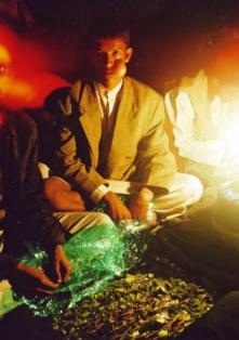 趣向品と言うと何を思い浮かべますでしょうか。人によっては酒、人によってはタバコでしょう。イエメンはイスラム国家なので原則酒は禁止です。で、タバコを吸う人もいますが、やはり主流はカートです。カートとは若干の高精神作用のある葉っぱの種類です。ええ、イエメンの男は葉っぱをかじってるんです!初めて見た時「お前ら青虫か!」と叫びたい衝動に駆られました。本当にイエメン人男性はみんなカートを食べてます。サナア近郊で取れた朝積みカートはしないで売られます。んで、普段はのんびり屋のイエメン人もカートになると豹変。(正確にはカートと運転に関しては豹変)真剣にそのよしあしを選びます。お隣の国、サウジアラビアでは麻薬とみなされ禁止されてますが、イエメンではカートあってのイエメン状態です。無論、強い中毒性があったり、幻覚作用がある訳ではないです。日本でタバコがOKな様に、イエメンではカートがOKなレベルです。ちなみに味は苦いです。もう苦すぎて最初はいたたまれない気分です。でもなんとなくはまる気持ちが解るんですよねー。さて、このカートのたしなみ方は以下の通り。要するに葉っぱを噛み、唾液と混ざったエキスを飲む訳です。しかし、食べカスの葉っぱははき捨てたり、飲み込んだりしません。片方のほっぺの中にどんどんつめて溜めていきます。もちろん、ほっぺはどんどん膨らんでいくのですが、これがでかい!ちょっと露出の関係でイッちゃった感じに写ってますが…町のカート売りのお兄ちゃんです。このお兄ちゃんはとても愛嬌が良く、「日本人か?カート食え!」ととてもフレンドリー。こんな写真しか撮れなかったのが悔しい位いいやつでした。※モデルはトランス状態ではありませんご覧の通り、ほっぺたがめっちゃ膨らんでます!そうか、なぞは全て解けた。日本昔話コブ取り爺さんはイエメン人だった!