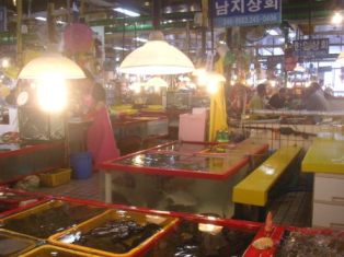 旅の楽しみの一つが市場巡り。その土地ならではの食材が見る事が出来るし、人々の生活が肌で感じる事が出来るのがまたナイス♪でも市場で売られているものは大抵生の物ばかり。だから旅行者であるワタシにはなかなか購入してそれを自分の舌で確かめる事ができないのが残念でなりません。そんなあなた(どなただよ)に朗報!チャガルチ市場では生簀の魚をその場でさばいてくれるんです。那覇に行った時に見た公設市場と同じ感じですね。ここでも多くの店主に声を掛けられます。「へーイ!うちの店で食ってかないかい?」「兄ちゃん!こっちの方が新鮮だぜ!」「そこの若いの!この魚はうちしかないぜ!」と言ってるんだと思います。活気があるのはとても気持ちいいので好きなんですが、なにぶん韓国語なんでイマイチ何を言ってるか解りません。そんな那覇でもそうでしたが、見たことが無い魚ばかり。でも大きく異なるのは魚の名前が解らないんです。沖縄だとなまりこそあれど、魚の名前が解ります。でもここは韓国だから全然解りません。「オバちゃん、これ、名前、何?」と訪ねても「○ב$%&△イムニダ♪」とニコニコ。解んねぇ…(T∀T;)イムニダしか解んねぇ…(T∀T;)イムニダ→