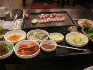 釜山から移動する事一時間。所変わりましてここは韓国最大の町ソウル。本来釜山から美味い物を食べつつ北上する予定でした。でも悲しきサラリーマン。限られた休日故省略し一気にソウル。海鮮料理ばかり食べていた私は少し趣向を変え肉を食べます。日本でも時たま韓国料理店で食べる私の好物、サムギョプサル!日本語に直訳すると三段腹なのは聞かなかった事に。共食いと言った友の言葉も聞かなかった事に。サムギョプサルは豚の三枚肉を使った焼肉。安価なのにおいしいので韓国人にも大人気の料理なんです。そんなサムギョプサルでも最近の若者に特に人気な物があるとか。早速潜入し調査することに。これが噂のワインサムギョプサル!そう、名前の通り肉をワインに漬け込んで柔らかくしたそうです。実際食べてみるとワインの味はしませんが心なしか柔らかい。どこの店でもやってる訳じゃないんだけど、確実に人気メニュー。食べ方はいたって簡単。肉を焼き、それに少量の塩とごま油を付けます。その肉をサンチュにコチュジャンと唐辛子とニンニクと共に巻く。そして周りの目なんか気にしないで一心不乱にかぶりつく。ビールがあればなお良し♪ソウルに行った際には私サムギョプサルを召し上がってみて!三段腹→