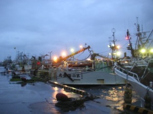 毎週日曜日に八戸港では朝市が立ちます。その時間は早朝も早朝、午前五時からです!午前五時となると起床は四時、私が通常寝る時間です(笑でも珍しいものの私。って言うか、「うまいものにありつける!」と言う事実。食い意地が固形化したような人間私には十分すぎる早起きの理由。で、当日、バスも走り出す前からタクシーを捕まえて朝市まで。あれ?ほとんど誰もいません。車が数台広ーい広い駐車場にまばらに…。そして吹き荒れる嵐の様な風雨。近くにいた地元人っぽいおばちゃんに尋ねます。「あのー、朝市が立つところってここですよね?」「あー、ごんだけ風雨が強いがら中止がねぇ~」がび~ん!10月に台風?→