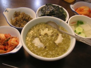 暖かいオンドルの部屋で一晩を明かし、釜山の町へ。もちろん目的は朝ごはんですが、珍しく朝粥です。何が珍しいかって私はあまり粥が好きじゃないから。なんか病人用の食事ってイメージがあってさ…。でも外国ではその限りではない。韓国では朝食に粥が多く食べられる。中国でも、シンガポールでも同様みたい。んで、こっちのお粥はもっと度六としてしっかりしてるんです。チャングムの誓いでお粥が出てるシーンが確かあったなぁ…。そんな単純な理由から朝食は近くのお店でアワビ粥に決定。おいしそうじゃないすか?日本だとお粥はしろか淡い黄色が定番ですけど、これは茶緑。なんでかって言うとアワビの肝を混ぜてるからなんです!アワビは海草とか食べてるから肝がこんな色になるんだと。味は正直はっきりとは覚えてない。いや、おいしかったのです。それは間違いなくおいしかったのです。熱すぎて舌を火傷し、味どころではなかったんです(T∀T;)それもこれも私が食べる食事をフーフーしてくれる人がいないからだ(T∀T;)フーフー→