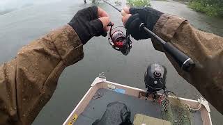 ◇2025年7月2日◇Saltyfish & 蛙太郎のバスフィッシング2025◇桧原湖◇雷鳴とともに、急に激しい雨が降り出しました。落雷の恐れもあるし、ボート内に雨水が溜まるし、視界は悪くなるし・・・危険な状況です。湖上には他にボートは、いなくなりました。すぐに上陸できるように桟橋近くまで引き上げ、様子を見ることにしたのです。この雨はピンチとなるのか、チャンスとなるのか? まだ午後1時でしたので、私は雨脚が弱まりチャンスが来るのを待っていました。蛙太郎も同じ気持ちだったはずです。(続く)クリックしていただけますと嬉しいです!