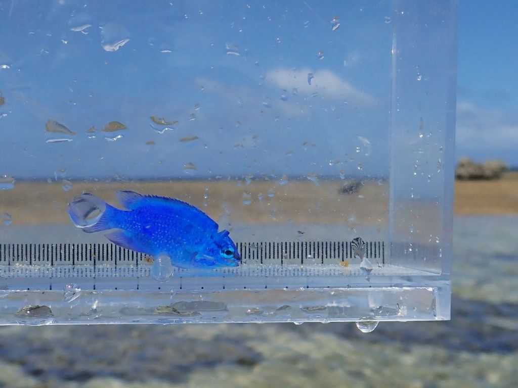 ◇2025年8月12日◇沖縄 備瀬崎海岸◇蛙太郎がルリスズメダイを捕ってきました。ブルーが綺麗です。ルリスズメダイを小さなネットで捕まえるなんて、簡単にはできません。この熱帯魚だって、すばしっこくて、私などには捕るのは無理でした。蛙次郎が「どうやって捕まえるの?」と聞くと、蛙太郎は「魚を狭い岩場に追い込んで、待ち伏せした網に入れれば捕まえられる。それより、おまえのように変な生き物を見つける方が難しい」と。蛙太郎が捕ってきたルリスズメダイでも、こんな立派なハゼでも、蛙次郎の捕ったコクテンフグのポイントには追いつきません。(続く)クリックしていただけますと嬉しいです!