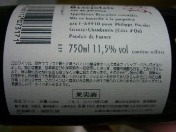 楽天市場で購入した↓ボジョレ~ 賞味しました(^^)さすが人気NO1です!!ほんとにほんと美味しかったです。大当たりでした♪酸化防止剤の味?も全然気にならなくて日本でこのようなワインが手に入るとは幸せですね~来年のボジョレもこれで決まりです。ラベルの裏には日本語で「このワインは、現在フランスで最も注目されている酒造家の一人であるフィリップ・バカレ氏が造りました。畑には農薬、除草剤及び化学肥料を一切使用しておらず、補糖や補酸も行なっておりません。また、彼は酸化防止剤の添加も限りなく少量に抑えております。そのためビン詰めの際に、発酵中に自然発生した炭酸ガスを意図的に残しております。フィルターにもかけておりませんのでビン内には澱が残っておりますが、このワインは<自然からの恵>だけで造られておりますのでご安心下さい。素晴らしいパーティーでありますように。」と記入されています。。上記の言葉通りのワインですね。贈り物にも喜ばれると思います。まだ今年のボジョレーを味わっていない方は是非ご賞味下さいね。私はもっとまとめて注文したら良かったな~と後悔です。追加注文しようかな。2本とも、それぞれ個性があってどちらも味わい深かったです(^^)これで間違いない!です(笑)