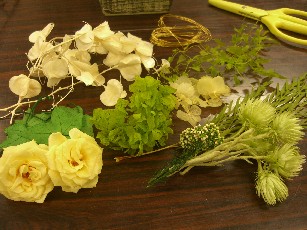 もどりましたーまずは・・・レッスン報告を今回は参加者9名さま~とっても賑やかなレッスンでしたあすも同じぐらいです。<花材> 天然木~ こちらの網?が土台となりまーす メインのバラの花はあわ~いイエロ~*e-toku*大好きな色で~す以前のレッスンブーケのコサージュ こちらを作ったときに学んだワイヤリング~バラ、アイビーワイヤーで軸を固定しました↓ラッピング~ これまたグ~ 縦にかけることも、横がけにもできるように作りました☆ 幸せな時間をありがとうございました