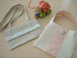 昨日今日とわが家は静かです。。というのも 私が風邪っぽいので 娘を実家にお泊まりさせてるのです☆あ~ 平和だわぁ~♪♪d(´▽`)b♪こんな平和な時間帯に寝てるのももったいないし、きのうはずーっとハンドメイドをして過ごしちゃいました。昨日作った内のメイン2つが 娘のバッグ。手提げタイプとショルダータイプにしました☆ 布を見ながら イメージやサイズを決めて、「こうしたらどおなるかなぁ~、こうした方がかわいいかな~」って今は頭を悩ましながら、冒険しながら作ってます。なのでただでさえ優柔不断な私は すごく時間がかかるのです。。(;´д` ) トホホバッグにつけてある くるみボタンも作ってみました♪ これって簡単で超楽しい♪o(*^▽^*)o専用のキット(350円くらい)を買って 誰でも簡単に作れてしまうので、自分の好きなボタンが作れて とっても楽しい! これは以前作った わたし用の小バッグ。。。 ちょっと近所に買い物って時にいいかなって思って。。さっき 母から電話があったのですが、「ママに電話するよ~」って言ったら、娘が「いいよぅ、ままにでんわしなくて いいよぅーー」って言ったらしい・・・。か、悲しいじゃないかぁー わが むすめぇ~~!!(T△T) また ばあばの家に泊まる気満々らしいので、私も甘えて今日も泊まらせることに。昼間はいなくて あ~ 平和だなぁ~って思うんだけど、夜寝るときに いつも隣で寝てる娘がいないってのが寂しく感じました。夜中におもしろい寝言を聞くこともなく 熟睡できたけど♪この間 「ご飯たべないと もったいないオバケがでるよ!!」って言った日の夜、寝言で 「かれーたべるからぁ~ かれーたべるからぁ~」って叫んでました(笑) おばけでもでたのかな(=^m^)ぷぷぷ